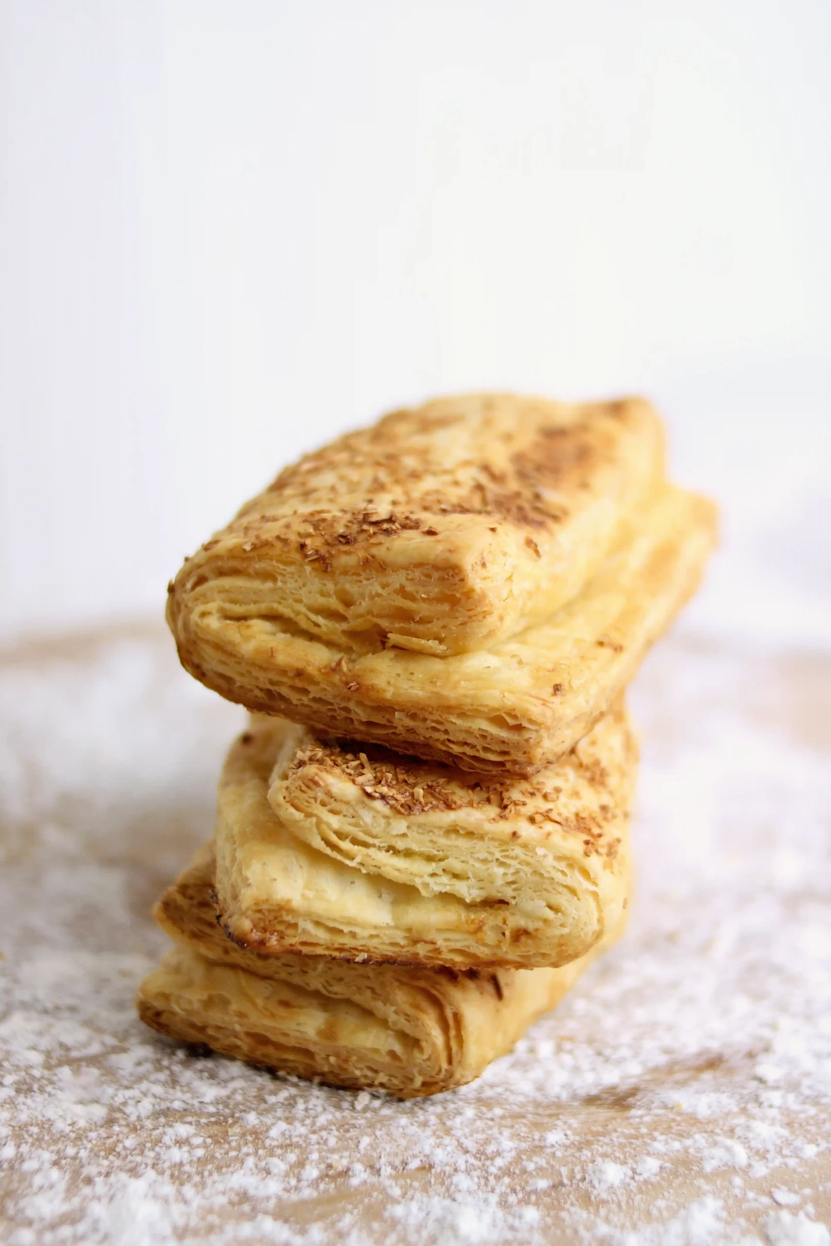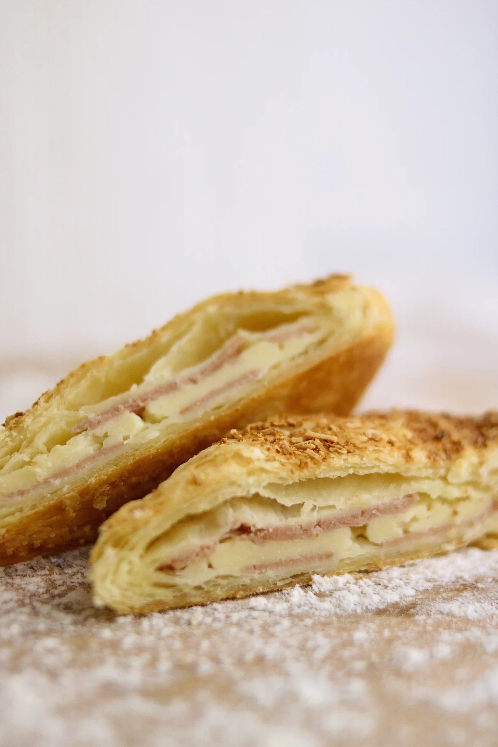 Relleno con jamón y queso mozzarella, su hojaldre es 100% mantequilla respetando la clásica receta francesa, el hojaldre no lleva adición ni de huevo, ni de azúcares, ni levadura añadida agua, contiene poca sal y harina de trigo elite. Peso total: 120 gr.